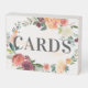 Wedding "Cards" sign features dark gray text framed by a rustic floral watercolor wreath of beautiful roses, dahlias, peony flowers, and greenery, in a gorgeous summer or autumn palette of burgundy red, golden yellow, peach orange, blush pink, and shades of green. Perfect for a bridal shower or wedding reception.