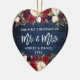 Rustic Blue Wood, Modern Brush Script, Watercolor Burgundy Marsala Floral, Our First Christmas as Mr. and Mrs. Heart Wedding Ornament