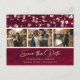 Personalized burgundy and gold wedding photo save the date postcards with an elegant script font. Our wedding save the date features a photo collage of 3 images against a rustic burgundy wood background adorned with string lights. Easily personalize this rustic chic photo save the date postcard with your images and wedding details including a wedding website, if desired. For custom requests, please send us a message.