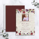 This beautiful, rustic floral funeral / memorial service invitation featuring a photo of the deceased and burgundy and purple watercolor floral elements on a faux birch bark background. Copyright Elegant Invites, all rights reserved.