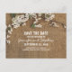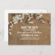 Rustic country save the date postcards with vintage burlap background texture and white blossoms branch.