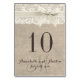 This rustic table number card features a burlap look background with a printed image of lace and ribbon. Perfect for a vintage or rustic themed wedding or reception. Coordinates with our full line of Rustic Burlap and Lace products.