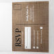 3 in 1 rustic country wedding trifold invitation featuring a rustic brown burlap effect background, elegant mason jar string twinkle lights, the sayings "EAT, DRINK AND BE MARRIED" and "LOVE TRULY, DRINK DEEPLY AND DANCE BADLY". You are able to add a personalized photo of you and your partner, the wedding details such as accomodation information, webiste details, the invitation, and an rsvp postcard for your guests to cut off and send back.