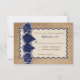 This modern and trendy rustic brown FAUX burlap look wedding reply card is shown here on basic paper. It has a PRINTED navy blue lace band with a PRINTED navy blue bow on it, and an ivory and navy blue scroll edged template text area on it that matches the wedding invitation shown below. It is easily customized with your own information. ***PLEASE be careful if you change the paper type. ***PLEASE NOTE that if you change the fonts, or the size of the font, some of your text may get cut-off. Everything will print as it appears on your monitor. I will NOT see your order and Zazzle will NOT edit or correct anything, so please be sure you have no typos or mis-aligned text. If you need assistance, please email me BEFORE you place your order. If you need this formatted for a different event, or if there are any other matching items you need to make your event extra special, please email your request to niteowlstudio@gmail.com. Existing matching items are shown below.