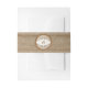 Rustic simulated burlap and wood floral lace monogram initial wedding invitation belly band. Change out the monogram for your own. The burlap and wood is simulated by the graphic design and it is printed all on paper. There aren't any raised or 3D embellishments. The wood emblem is also printed on the paper. Great for a rustic, country, farm, barn, or outdoor wedding.