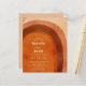 Boho style budget wedding invitation with an abstract arch painted in earthy desert colors of burnt orange, terracotta, rust and brown. Your wedding details are in a modern layout along with your names in a retro style font for a fun twist.