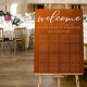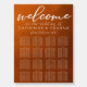 Follow the autumn trend of earthy tones with our burnt orange to brown gradient fall wedding welcome foam board with seating chart for up to 16 tables. Simple white typography on a rustic poster for a minimalist look. Bohemian hues reminiscent of terracotta clay highlight your elegant calligraphy on this trendy color fade sign.