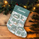 Personalize this rustic woodland Christmas stocking, with a pattern of cozy holiday cabins in the snow-covered pine forest.