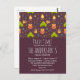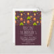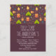 Family reunion invitation postcard with a fun camping themed pattern. Set on a reddish brown background. Elements in the pattern include a campfire, a tent,. a guitar, a shovel and backpack.