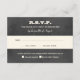 A coordinating RSVP card featuring a vintage-style "R.S.V.P." header on a dark chalkboard background with a cream response band for guest names and attendance. This variation includes two entree preference checkboxes on the bottom chalkboard band for a streamlined meal selection. All text including reply date and meal options is fully editable.