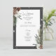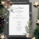 This wedding program design features a rustic green pine and pinecone bouquet on a soft charcoal black background with white flowers. It is accented with a white sparkle overlay to illustrate the magic of the beautiful winter holidays. Perfect for a Christmas or winter wedding. Created by Simply Farmhouse Press.