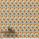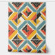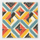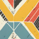 This artwork presents a dynamic and textured pattern of chevron and triangular shapes arranged in a bold mosaic. The design features a vibrant yet earthy color palette of teal, mustard yellow, red, and black, set against a cream background. The pattern is distressed with subtle scratches and rough textures, giving it a rustic, worn-in appearance. The geometric arrangement creates a sense of movement and depth, while the bold lines and contrasting colors evoke a sense of energy and vitality, reminiscent of vintage textiles and handcrafted designs.