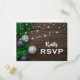 Rustic corporate christmas response postcard featuring a rustic dark wood background, xmas string lights, fir branches, decorations, and a festive rsvp template that is easy to personalize.