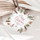 Rustic neutral Christmas favor tags featuring a watercolor Christmas border with pine cones, ornaments candy cane and Christmas berries.