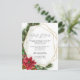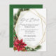 Trendy rustic christmas wedding guest details cards with gold geometric frame and handwriting typography featuring sleigh bells, poinsettia flowers, holly, mistletoe and pine.