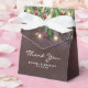 Personalized christmas favor boxes featuring a dark wooden background, festive christmas tree branches, red & gold tree decorations, pine cones, string twinkle lights, the title 'thank you', and your names.