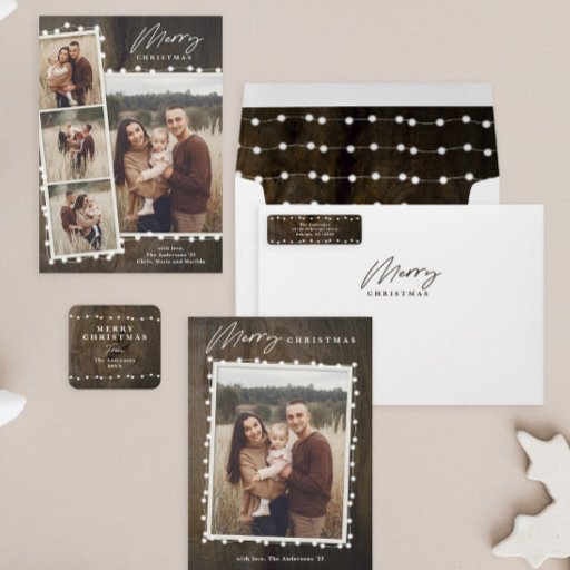 Rustic Christmas Lights 4 Photo Collage Holiday Card
