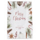 Rustic neutral Christmas gift bags featuring a watercolor Christmas border with pine cones, ornaments candy cane and Christmas berries.