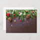 A postcard with a rustic photograph of a brown wooden table with pinecones, pine needles, snow, and Christmas ornaments. Festive and lovely.