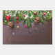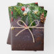 Wrapping paper sheets with a rustic photograph of a brown wooden table with pinecones, pine needles, snow, and Christmas ornaments. Festive and lovely.