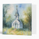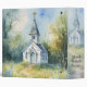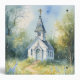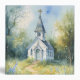 This serene countryside scene captures a quaint white chapel nestled at the end of a winding dirt path, surrounded by blooming wildflowers and softly swaying grasses. Rendered in a delicate watercolor style with painterly splashes and gentle light, the composition evokes peace, nostalgia, and quiet faith. The wildflower meadow—full of bluebells, daisies, and soft greens—creates a dreamy, almost ethereal foreground that leads the viewer’s eye toward the charming steepled church under a calm blue sky. Perfect for evoking a sense of retreat and reflection, this design works beautifully as seasonal decor, especially for spring and Easter themes. It pairs well in cozy cottagecore spaces or country-inspired settings, bringing warmth and spiritual calm to any room. The golden cross atop the steeple and gothic-style arched doorway add vintage architectural charm while maintaining a harmonious balance with the natural surroundings. This is an inviting visual retreat into simplicity, faith, and nature. AI generated artwork.