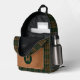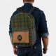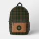 Rustic looking backpack done in the green and tan clan Fitzsimmons Scottish tartan pattern. Graphics of a tan leather pattern, covers the pocket area. Personalize the one letter monogram, set in a circular plaque, to suit your needs. Great for school, work, travel and more.