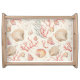 Immerse yourself in the timeless allure of coastal aesthetics with this meticulously crafted serving tray. This serving tray captures the serene beauty of the ocean's treasures, featuring intricately detailed seashells, starfish, and coral reef motifs set against a rustic, vintage-inspired backdrop. The weathered textures and muted color palette evoke a sense of nostalgia, reminiscent of classic nautical décor. Ideal for enhancing interiors with a touch of seaside charm, this design seamlessly blends natural marine elements with vintage artistry, offering a tranquil and sophisticated ambiance.