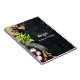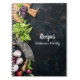 A cookbook notebook for your favorite family recipes. Fresh food, herbs, basil onions, a wooden cutting Board a herbal chopper on a painter's dark rustic canvas with paint stains. Template for your text and family name.