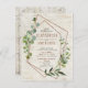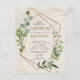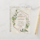 Modern and trendy, this postcard wedding invitation design features a faux copper geometric embellished with watercolor eucalyptus greenery, over a faux white birch bark texture. The couple's names and some wedding details are in a matching copper color, and the back of the postcard features a stand of birch trees. Copyright Elegant Invites. All rights reserved.