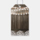 Rustic bridal shower thank you gift tags featuring a country barn oak barrel background, twinkle string lights, baby's breath, your initials, and a thank you template that is easy to personalize.