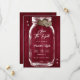 Personalized burgundy rustic mason jar wedding save the date cards featuring a mason jar and burlap hearts against a barn wood background adorned with twinkle lights. Easily personalize online. Matching items available to complement these burgundy wedding save the dates.