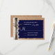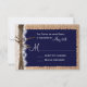 This rustic wedding invitation is perfect for any country wedding. It features a rustic printed burlap background with printed lace and twine on the side. The lettering on top of a navy blue rectangle that has tattered edges. Perfect for a country or barn wedding. Just add your RSVP date to the card. The burlap, twine, and lace are just printed designs. It is not actual burlap fabric, lace, or twine.
