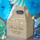 Rustic country wedding thank you favor box featuring string lights on a lights burlap background.