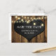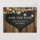 Personalized rustic country wedding save the date postcards featuring a chalkboard heart and string lights against a barn wood background.