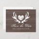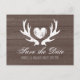 Brown Barn wood country chic deer antler wedding save the date cards. Part of rustic hunter / hunting theme set. elegant design with vintage faded heart. perfect for summer outdoor garden marriages in july and august. Personalize with name of bride and groom plus date of getting married. Customizable background color. Stylish distressed script typography. Beautiful vector artwork for trendy wedding.