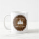 Stylish, country rustic themed coffee mugs, featuring your name and "Family Cabin", Ranch, Cottage or other text along with its established date and location if desired. This custom, unique design features rustic country style text with a white silhouette of pine trees on a round print of wood planks. To see more designs like this, feel free to visit my store here at "Zazzle.com/Rustic_Charm". Thanks.
