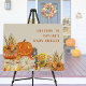 Fall Welcome Easel sign which you can customize for any occasion, such as baby shower, halloween part, thanksgiving dinner etc. Rustic fall porch display of pumpkins, jack o lantern, Boo porch sign, burnt orange sunflowers and golden yellow autumn flowers.
