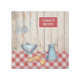 Rustic country kitchen gallery wrap has a red checked tablecloth against a wooden wall. A colander and pitcher, rolling pin and wooden spoon are on the table. More kitchen utensils are hanging on the wall. Personalize it inside the red sign hanging on the wall. Please note: This should only be purchased in a square version as it will not be positioned correctly otherwise.