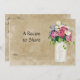 COLOR PALETTE: tan, white, pink, lavender, purple and green DESIGN COLLECTION: This matching bridal shower recipe card for sharing your favorite family recipe, is perfect for a country rustic style backyard DIY wedding. There is a complete wedding invitation set to match. The ball or mason style canning jar was hand painted in watercolor by Audrey Jeanne Roberts as were the pink roses, lavender and white irises, calla lilies and pink hydrangeas along with english ivy that is loosely arranged in the vase. The background is a hand painted crackle finish that is both rustic and yet elegant with subtle swirl flourish motif patterns in it. This design is available in a wide assortment of flower styles and colors. If you have a particular flower in mind for your wedding, we may have art to match it, just message us and we're happy to help.