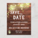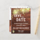 Rustic country wedding wood mason jar string of lights tree branch with green leaves Save the Date postcard. The glowing string of lights illuminate the green leaves against a beautiful rustic dark brown wood. This rustic wedding design is customizable and perfect for your beautiful outdoor country wedding or western wedding.