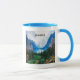 A personalized mug with a beautiful photograph of a pleasant and tranquil nature scene. Vibrant green forest in the front and shadowy blue mountains in the back. With a dreamy cloudy white sky. Misty and magical feel.