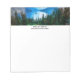 Notepad with a beautiful photograph of a pleasant and tranquil nature scene. Vibrant green forest in the front and shadowy blue mountains in the back. With a dreamy cloudy white sky. Misty and magical feel.