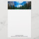 Stationery paper with a beautiful photograph of a pleasant and tranquil nature scene. Vibrant green forest in the front and shadowy blue mountains in the back. With a dreamy cloudy white sky. Misty and magical feel. personalize with a name and address.