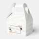 These favor or treat boxes are perfect packages for wedding favors for your elegant but rustic country wedding. They feature a light colored, white woodgrain background and floral accents in navy blue and soft peach or blush pink depicting peonies and roses with green foliage accents. The modern typography layout is a coordinating dark sage green for a romantic, gentle look.