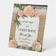 Romantic wedding pedestal sign featuring roses and green leaves on rustic wood with burlap and lace. Beautiful for a garden or barn wedding or a backyard celebration.