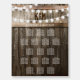 Rustic country wedding seating table chart foam board featuring a barn oak barrel background, twinkle string lights, and your monogram.
