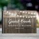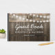 RUSTIC VINEYARD WEDDING GUESTBOOK | Country barn dark oak barrel background, twinkle string lights, your monogram and modern wedding wording. Find other wood wedding invitations at http://www.zazzle.com/special_stationery