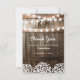 Personalized wedding thank you flat card featuring a country barn oak barrel background, twinkle string lights, baby's breath flowers, your monogram, a photo from your wedding, and a thank you template that is easy to customize.