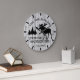 A rustic, unique, one-of-a-kind personalized design features a faux wood background with pine trees, a moose and the words, "THE WILLIAMSONS LIVING ON MOUNTAIN TIME EST. 20XX" in black typography. Personalize this clock by adding your own personal information. Makes a great wedding, anniversary, or housewarming gift. Click "personalize this template" to change the names and fonts to create a unique one of a kind design. What a nice accessory for your living room, bedroom, or family room. If you need any help with customization please email me at ybnormalone @gmail.com. Thanks for stopping by www.zazzle.com/WhisperingPines. ©Karen HallA rustic