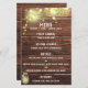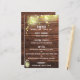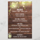 Rustic country wedding wood mason jar string of lights tree branch with green leaves wedding menu. 12.5 pt thickness / 110 lb weight paper. The glowing string of lights illuminate the green leaves against a beautiful rustic dark brown wood. This rustic wedding menu design is customizable and perfect for your beautiful outdoor country wedding or western wedding.